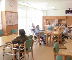 リハビリのため、食堂ホールで食事を |